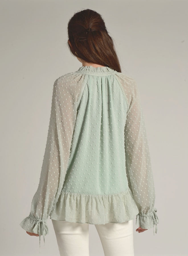 A modern take on the peasant top, this version features a peplum silhouette elevated with a dotted motif throughout.
