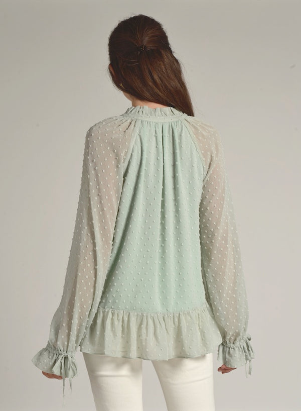DETAILS A modern take on the peasant top, this version features a peplum silhouette elevated with a dotted motif throughout. Ruffled split-neck with self tie Long raglan sleeves Ruffle drawstring cuffs Pullover style Polyester Gentle machine wash Imported SIZE &...
